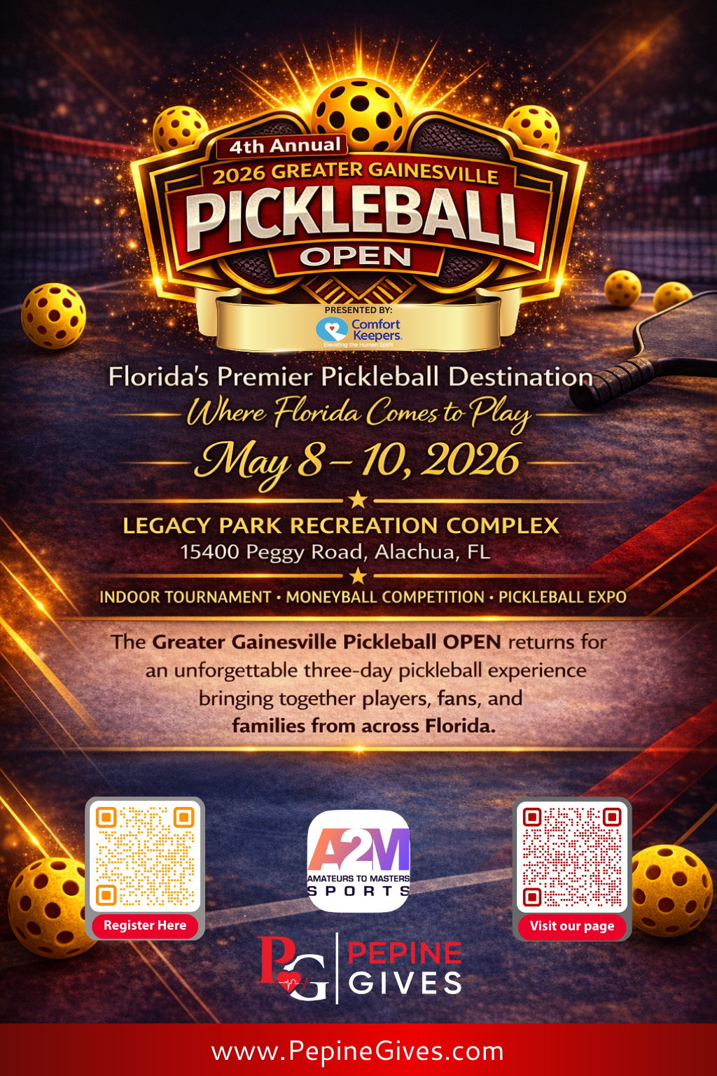 Welcome to the 4th Annual Greater Gainesville Pickleball Open—Where Florida Comes to Play! This premier regional event is hosted by Pepine Gives, a 501(c)(3) nonprofit foundation of Pepine Realty, and brings together pickleball players, families, and fans from across Central & North Florida.